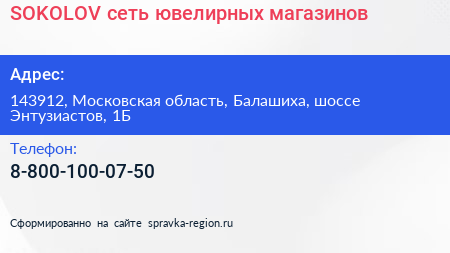 SOKOLOV, сеть ювелирных магазинов по адресу 143912, Московская область, Балашиха, шоссе Энтузиастов, 1Б в дальнейшем Организация, размещена в следующих категориях: