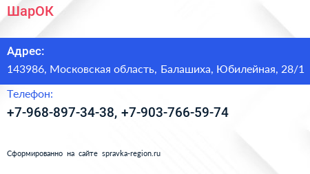 ШарОК по адресу 143986, Московская область, Балашиха, Юбилейная, 28/1 в дальнейшем Организация, размещена в следующих категориях: