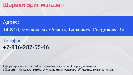 Шарики Бриг, магазин по адресу 143910, Московская область, Балашиха, Свердлова, 1в в дальнейшем Организация, размещена в следующих категориях: