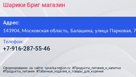 Шарики Бриг, магазин по адресу 143904, Московская область, Балашиха, улица Парковая, 7 в дальнейшем Организация, размещена в следующих категориях: