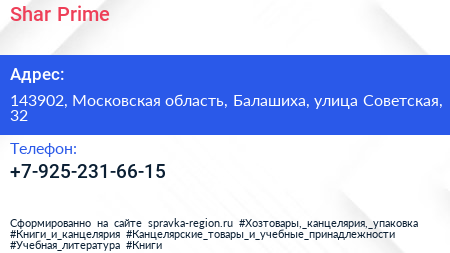 Shar Prime по адресу 143902, Московская область, Балашиха, улица Советская, 32 в дальнейшем Организация, размещена в следующих категориях: