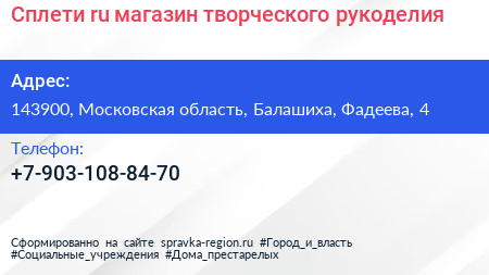 Сплети.ru, магазин творческого рукоделия по адресу 143900, Московская область, Балашиха, Фадеева, 4 в дальнейшем Организация, размещена в следующих категориях: