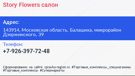 Story Flowers, салон по адресу 143914, Московская область, Балашиха, микрорайон Дзержинского, 39 в дальнейшем Организация, размещена в следующих категориях: