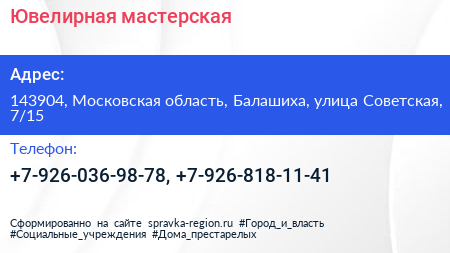 Ювелирная мастерская по адресу 143904, Московская область, Балашиха, улица Советская, 7/15 в дальнейшем Организация, размещена в следующих категориях: