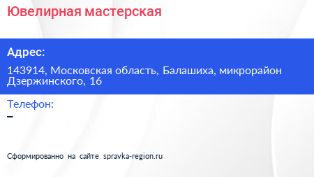 Ювелирная мастерская по адресу 143914, Московская область, Балашиха, микрорайон Дзержинского, 16 в дальнейшем Организация, размещена в следующих категориях: