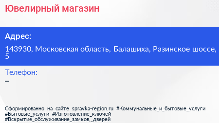 Ювелирный магазин по адресу 143930, Московская область, Балашиха, Разинское шоссе, 5 в дальнейшем Организация, размещена в следующих категориях: