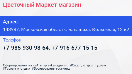 Цветочный Маркет, магазин по адресу 143987, Московская область, Балашиха, Колхозная, 12 к2 в дальнейшем Организация, размещена в следующих категориях: