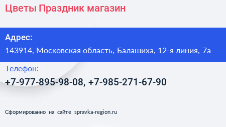 Цветы & Праздник, магазин по адресу 143914, Московская область, Балашиха, 12-я линия, 7а в дальнейшем Организация, размещена в следующих категориях: