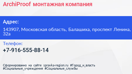 ArchiProof, монтажная компания по адресу 143907, Московская область, Балашиха, проспект Ленина, 32а в дальнейшем Организация, размещена в следующих категориях:
