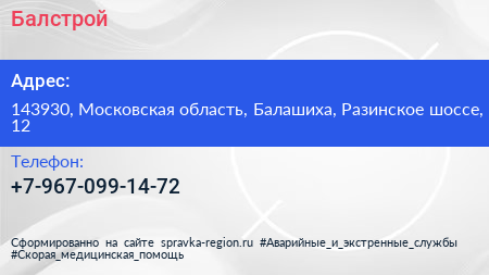 Балстрой по адресу 143930, Московская область, Балашиха, Разинское шоссе, 12 в дальнейшем Организация, размещена в следующих категориях: