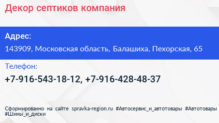 Декор септиков, компания по адресу 143909, Московская область, Балашиха, Пехорская, 65 в дальнейшем Организация, размещена в следующих категориях: