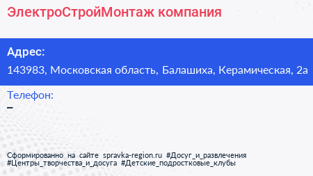 ЭлектроСтройМонтаж, компания по адресу 143983, Московская область, Балашиха, Керамическая, 2а в дальнейшем Организация, размещена в следующих категориях: