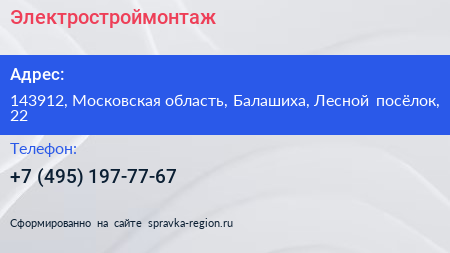 Электростроймонтаж по адресу 143912, Московская область, Балашиха, Лесной посёлок, 22 в дальнейшем Организация, размещена в следующих категориях:
