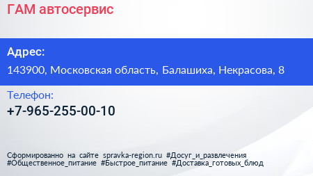 ГАМ, автосервис по адресу 143900, Московская область, Балашиха, Некрасова, 8 в дальнейшем Организация, размещена в следующих категориях: