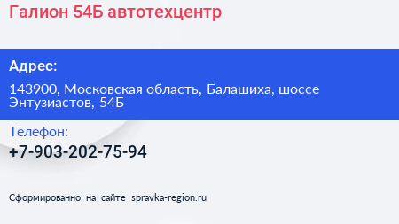 Галион 54Б, автотехцентр по адресу 143900, Московская область, Балашиха, шоссе Энтузиастов, 54Б в дальнейшем Организация, размещена в следующих категориях: