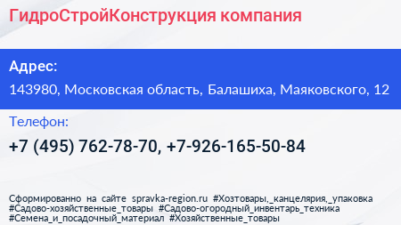 ГидроСтройКонструкция, компания по адресу 143980, Московская область, Балашиха, Маяковского, 12 в дальнейшем Организация, размещена в следующих категориях: