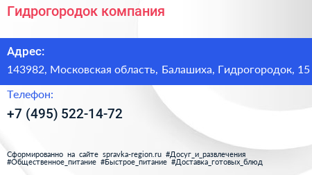 Гидрогородок, компания по адресу 143982, Московская область, Балашиха, Гидрогородок, 15 в дальнейшем Организация, размещена в следующих категориях: