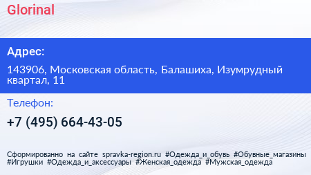 Glorinal по адресу 143906, Московская область, Балашиха, Изумрудный квартал, 11 в дальнейшем Организация, размещена в следующих категориях: