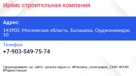 Ирбис, строительная компания по адресу 143902, Московская область, Балашиха, Орджоникидзе, 10 в дальнейшем Организация, размещена в следующих категориях: