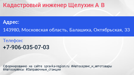 Кадастровый инженер Щелухин А.В. по адресу 143980, Московская область, Балашиха, Октябрьская, 33 в дальнейшем Организация, размещена в следующих категориях: