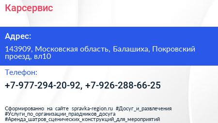 Карсервис по адресу 143909, Московская область, Балашиха, Покровский проезд, вл10 в дальнейшем Организация, размещена в следующих категориях: