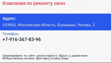 Компания по ремонту окон по адресу 143903, Московская область, Балашиха, Чехова, 3 в дальнейшем Организация, размещена в следующих категориях: