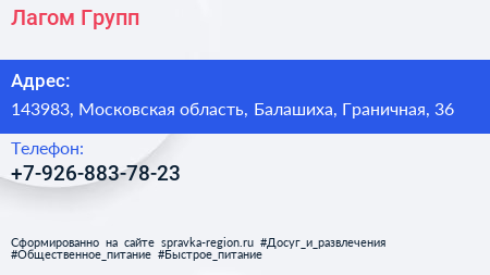Лагом Групп по адресу 143983, Московская область, Балашиха, Граничная, 36 в дальнейшем Организация, размещена в следующих категориях: