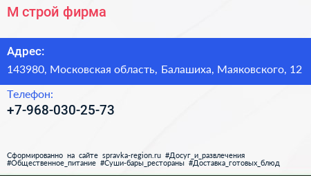 М-строй, фирма по адресу 143980, Московская область, Балашиха, Маяковского, 12 в дальнейшем Организация, размещена в следующих категориях: