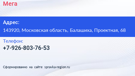 Мега по адресу 143920, Московская область, Балашиха, Проектная, 68 в дальнейшем Организация, размещена в следующих категориях: