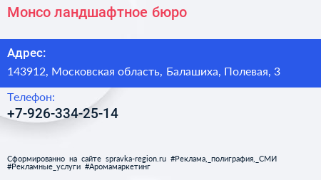 Монсо, ландшафтное бюро по адресу 143912, Московская область, Балашиха, Полевая, 3 в дальнейшем Организация, размещена в следующих категориях: