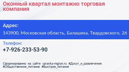 Оконный квартал, монтажно-торговая компания по адресу 143900, Московская область, Балашиха, Твардовского, 26 в дальнейшем Организация, размещена в следующих категориях: