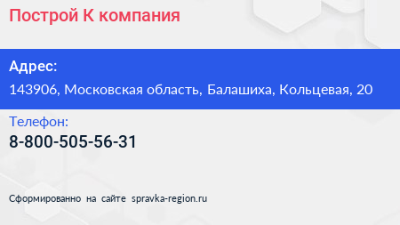 Построй-К, компания по адресу 143906, Московская область, Балашиха, Кольцевая, 20 в дальнейшем Организация, размещена в следующих категориях: