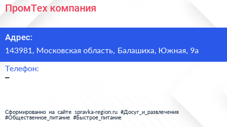 ПромТех, компания по адресу 143981, Московская область, Балашиха, Южная, 9а в дальнейшем Организация, размещена в следующих категориях: