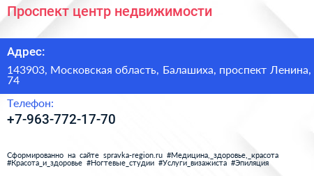 Проспект, центр недвижимости по адресу 143903, Московская область, Балашиха, проспект Ленина, 74 в дальнейшем Организация, размещена в следующих категориях: