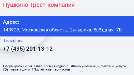 Пушкино Трест, компания по адресу 143909, Московская область, Балашиха, Звёздная, 7Б в дальнейшем Организация, размещена в следующих категориях: