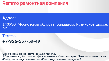 Remmo, ремонтная компания по адресу 143930, Московская область, Балашиха, Разинское шоссе, 69 в дальнейшем Организация, размещена в следующих категориях: