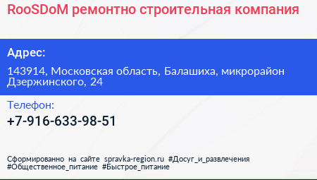 RooSDoM, ремонтно-строительная компания по адресу 143914, Московская область, Балашиха, микрорайон Дзержинского, 24 в дальнейшем Организация, размещена в следующих категориях: