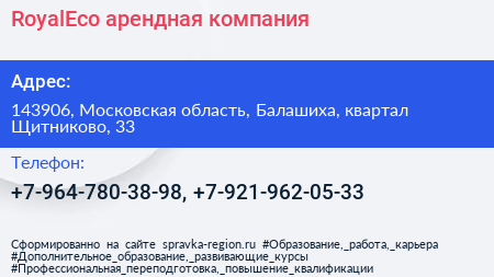 RoyalEco, арендная компания по адресу 143906, Московская область, Балашиха, квартал Щитниково, 33 в дальнейшем Организация, размещена в следующих категориях: