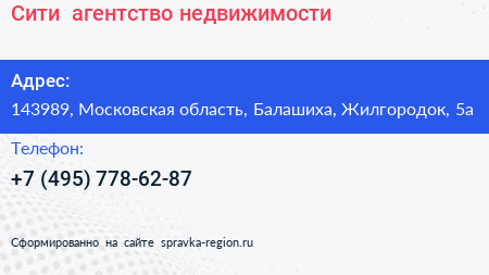 Сити+, агентство недвижимости по адресу 143989, Московская область, Балашиха, Жилгородок, 5а в дальнейшем Организация, размещена в следующих категориях: