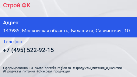 Строй-ФК по адресу 143985, Московская область, Балашиха, Саввинская, 10 в дальнейшем Организация, размещена в следующих категориях: