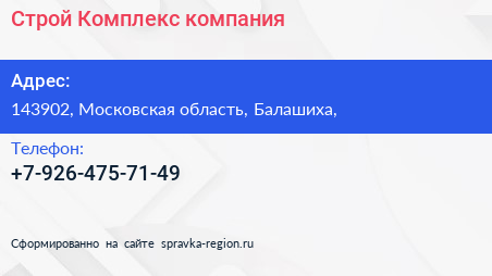Строй Комплекс, компания по адресу 143902, Московская область, Балашиха, в дальнейшем Организация, размещена в следующих категориях: