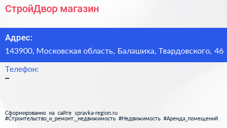 СтройДвор, магазин по адресу 143900, Московская область, Балашиха, Твардовского, 46 в дальнейшем Организация, размещена в следующих категориях: