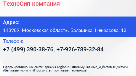 ТехноСип, компания по адресу 143989, Московская область, Балашиха, Некрасова, 12 в дальнейшем Организация, размещена в следующих категориях: