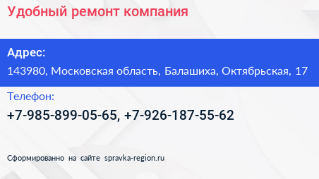 Удобный ремонт, компания по адресу 143980, Московская область, Балашиха, Октябрьская, 17 в дальнейшем Организация, размещена в следующих категориях: