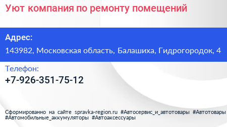 Уют, компания по ремонту помещений по адресу 143982, Московская область, Балашиха, Гидрогородок, 4 в дальнейшем Организация, размещена в следующих категориях: