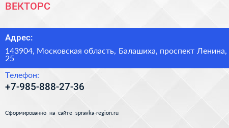 ВЕКТОРС по адресу 143904, Московская область, Балашиха, проспект Ленина, 25 в дальнейшем Организация, размещена в следующих категориях: