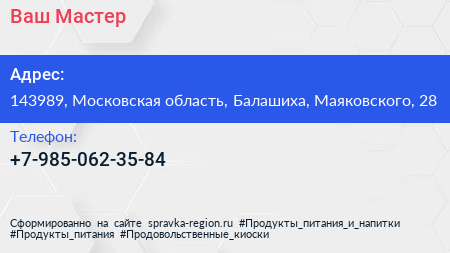 Ваш Мастер по адресу 143989, Московская область, Балашиха, Маяковского, 28 в дальнейшем Организация, размещена в следующих категориях: