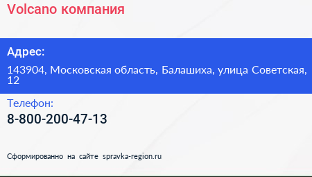Volcano, компания по адресу 143904, Московская область, Балашиха, улица Советская, 12 в дальнейшем Организация, размещена в следующих категориях: