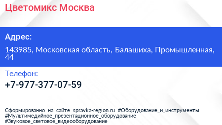 Цветомикс Москва по адресу 143985, Московская область, Балашиха, Промышленная, 44 в дальнейшем Организация, размещена в следующих категориях: