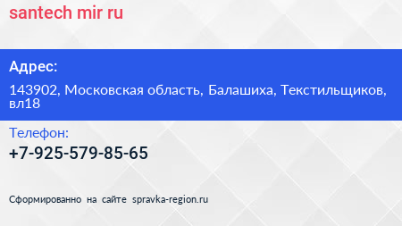 santech-mir.ru по адресу 143902, Московская область, Балашиха, Текстильщиков, вл18 в дальнейшем Организация, размещена в следующих категориях: